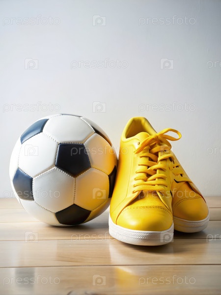 Желтые кроссовки и футбольный мяч на деревянном полу