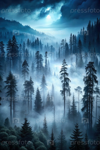 Зловесная ночь в густом лесу, окутанном туманом