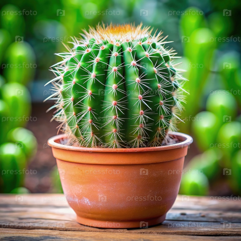 Зеленый баррельный кактус в терракотовом горшке на деревянном столе