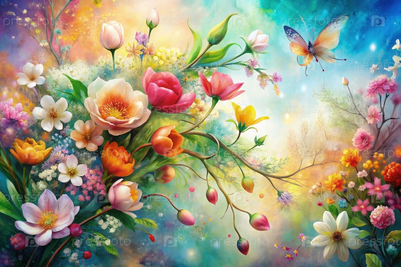 Цветный весенний цветочный букет с бабочкой. генеративная ИИ