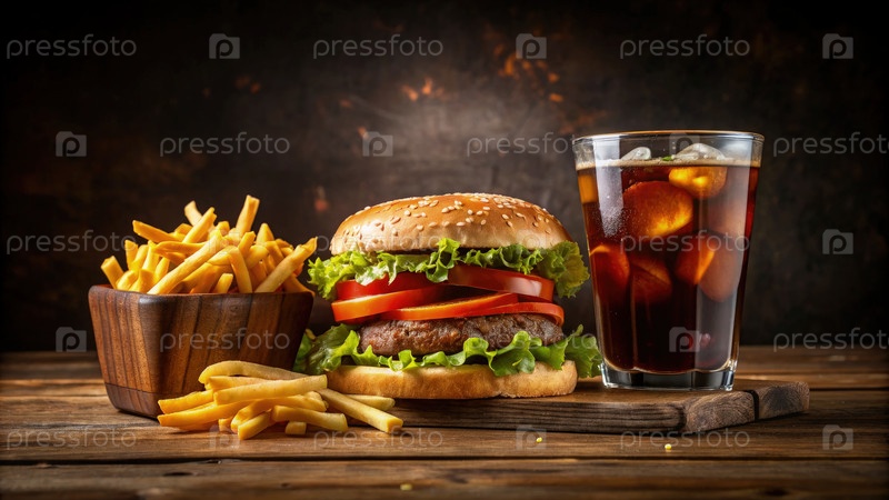 Классическое блюдо американского бургера с картофелем и мороженым напитком на деревянном столе