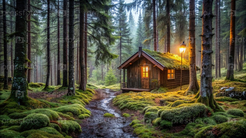 Уютный домик, расположенный в скандинавском лесу на закате