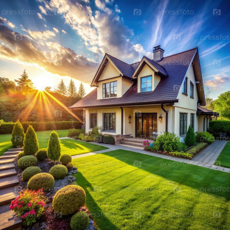 Солнечный загородный дом с богатой газоной и озелененным садом. генеративная AI