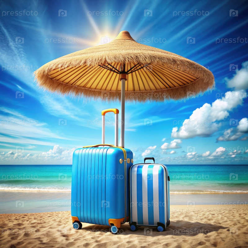Синие чемоданы под пляжным зонтиком в солнечный день