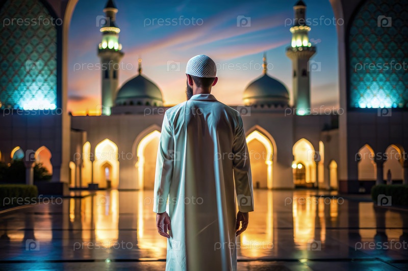 Подсвеченный силуэт молодого мусульманина в мечети вечером