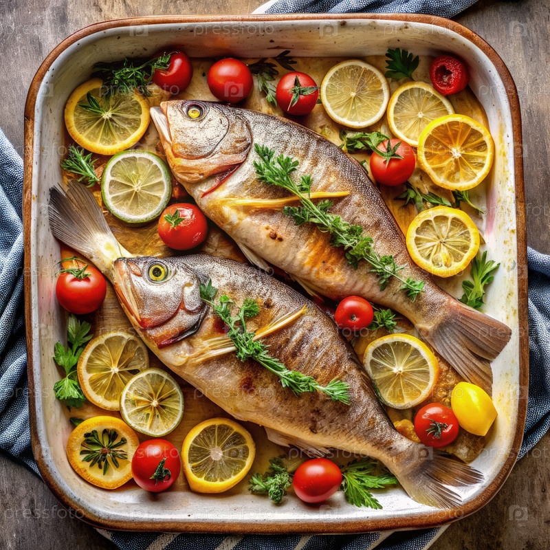 Главный вид рыбы с лимоном и помидорами в блюдечке для выпечки