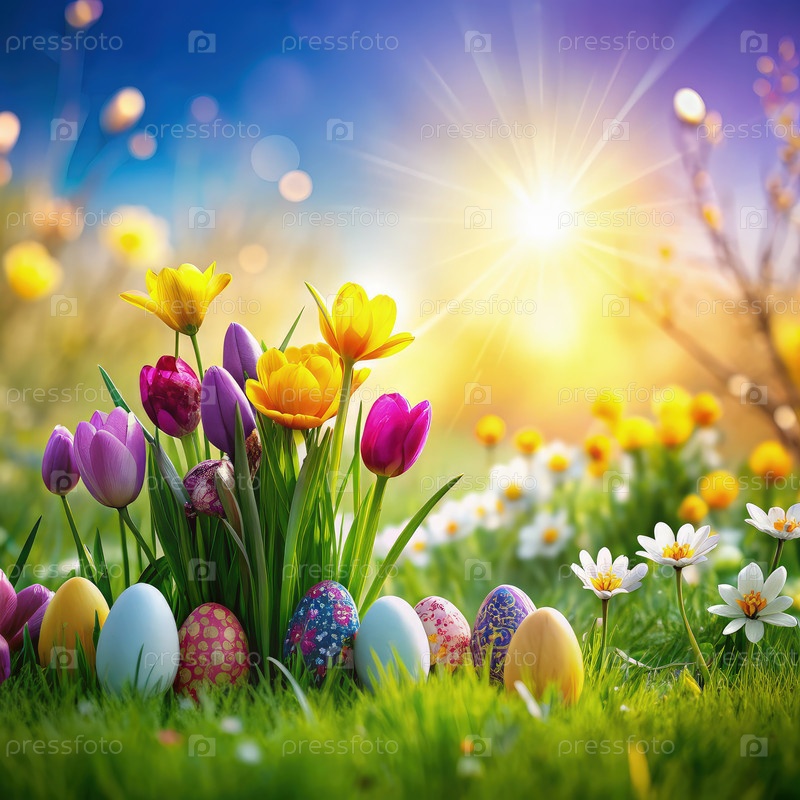 Красочные пасхальные яйца, заложенные среди весенних цветов и солнечного света