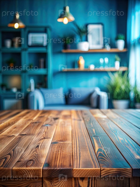 Деревянный столешничный стол с размытым фоном интерьера бара