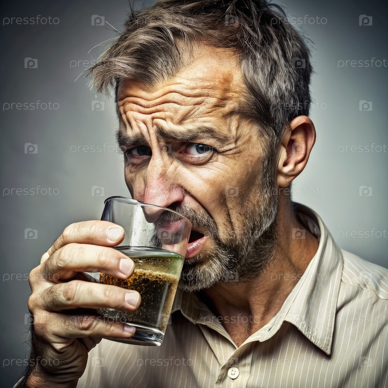 Мужчина пьет загрязненную воду и реагирует с отвращением