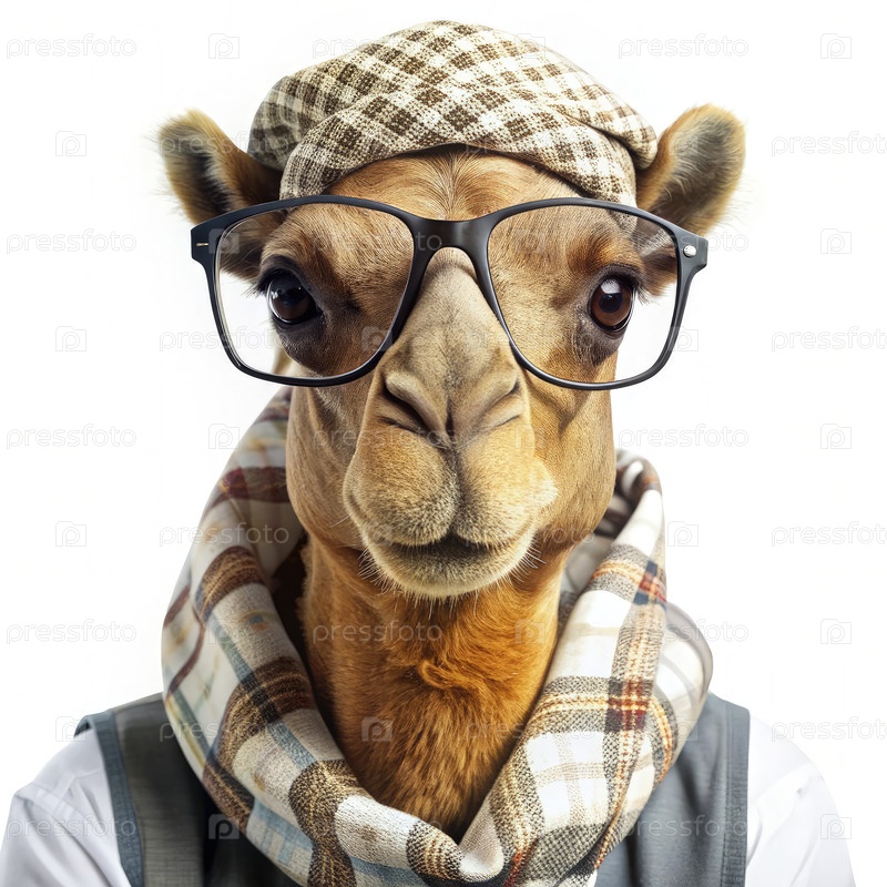Верблюд, носящий очки и плакатный шарф, смотрит прямо в камеру