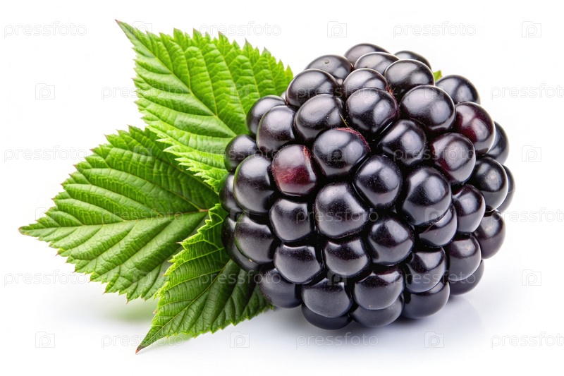 Свежая одиночная черная ягода с зелеными листьями на белом фоне