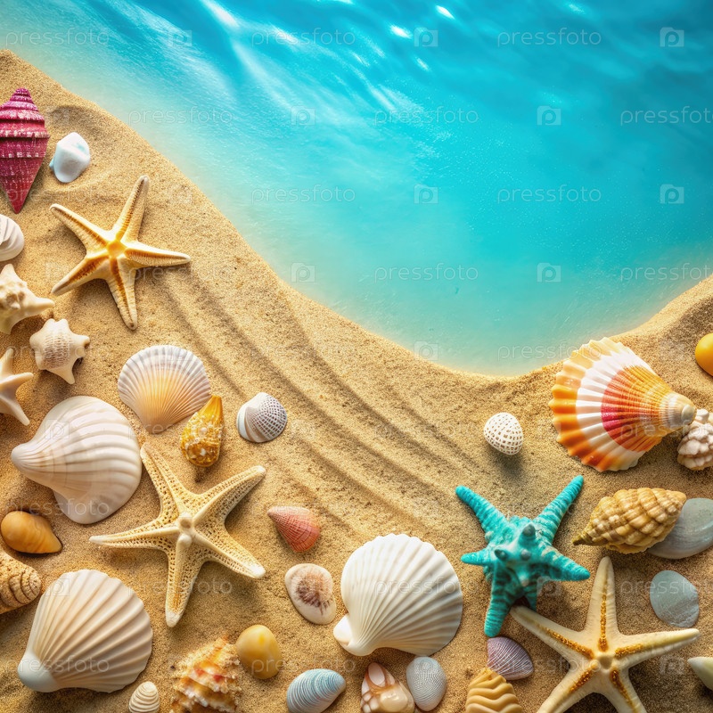 Красочные ракушки и морские звезды на песчаном пляже с голубым океаном