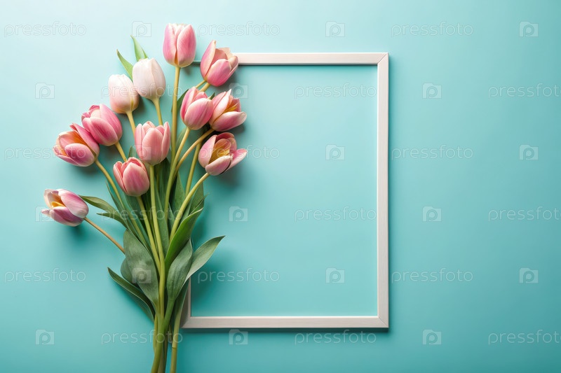 Розовые тюльпаны и белая рама на бирюзовом фоне