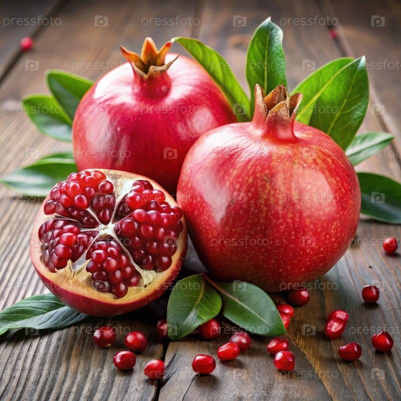 Зрелые гранаты с семенами и листьями на деревянном столе