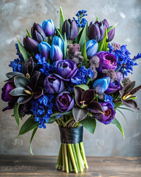 Таинственный букет черных тюльпанов и голубых цветов