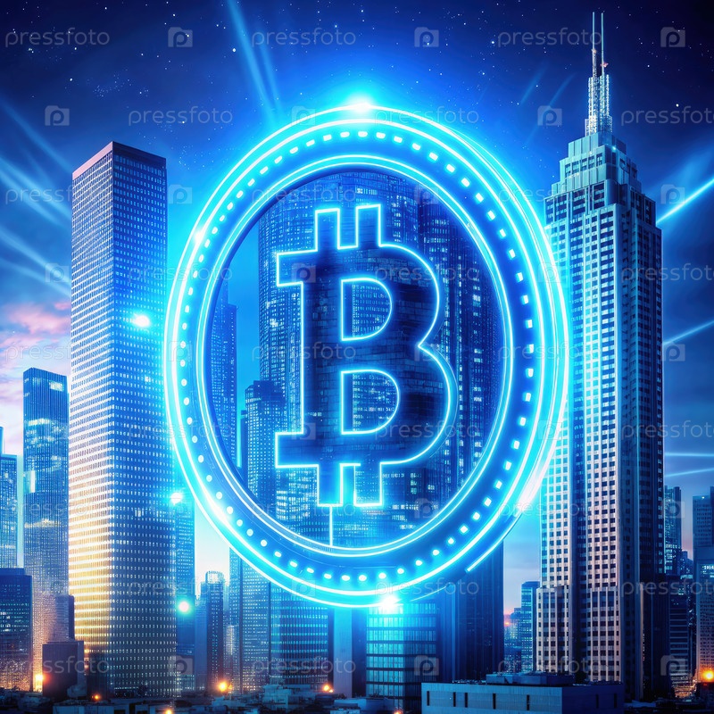 Голографический символ Биткойна, вращающийся над городским пейзажем ночью