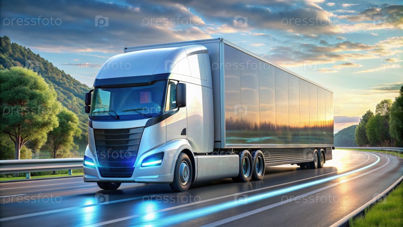 Автономный электрический полугрузовик едет по извилистой дороге на закате