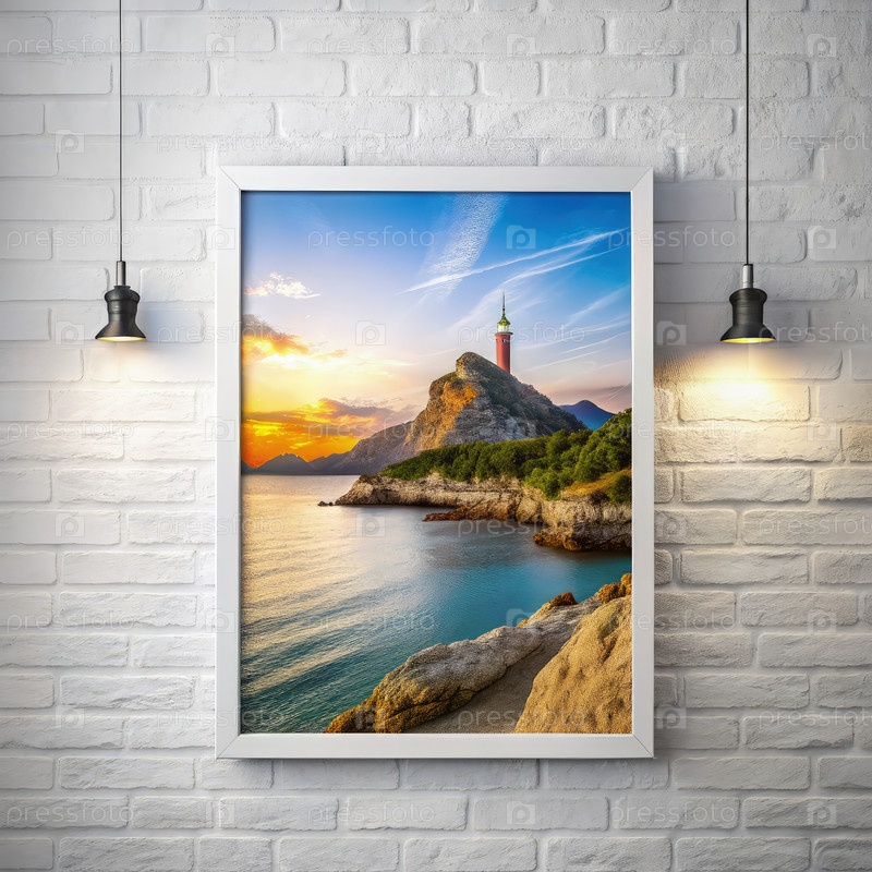 Белая кирпичная стена с обрамленным морским пейзажем