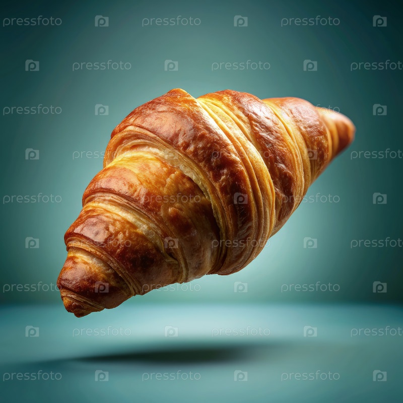 Свежевыпеченный кроассан плавает на зеленом фоне
