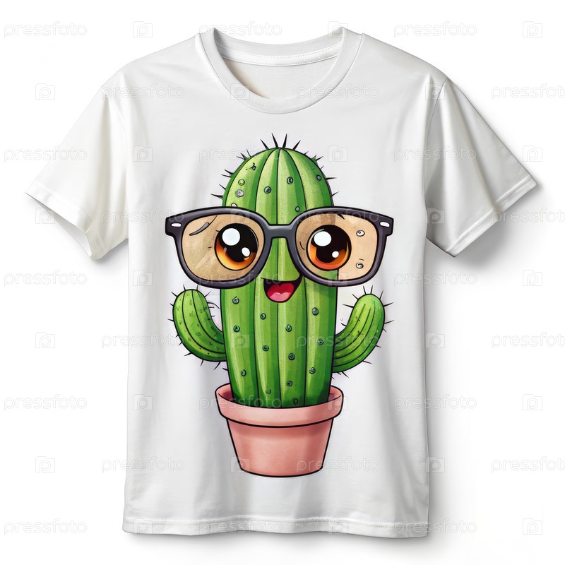Милый карикатурный кактус, носящий очки на белой футболке
