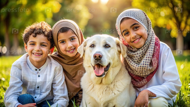Улыбающиеся дети и собака в парке