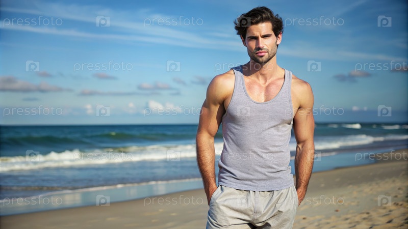 Человек в сером танковом топе стоит на песчаном пляже у океана
