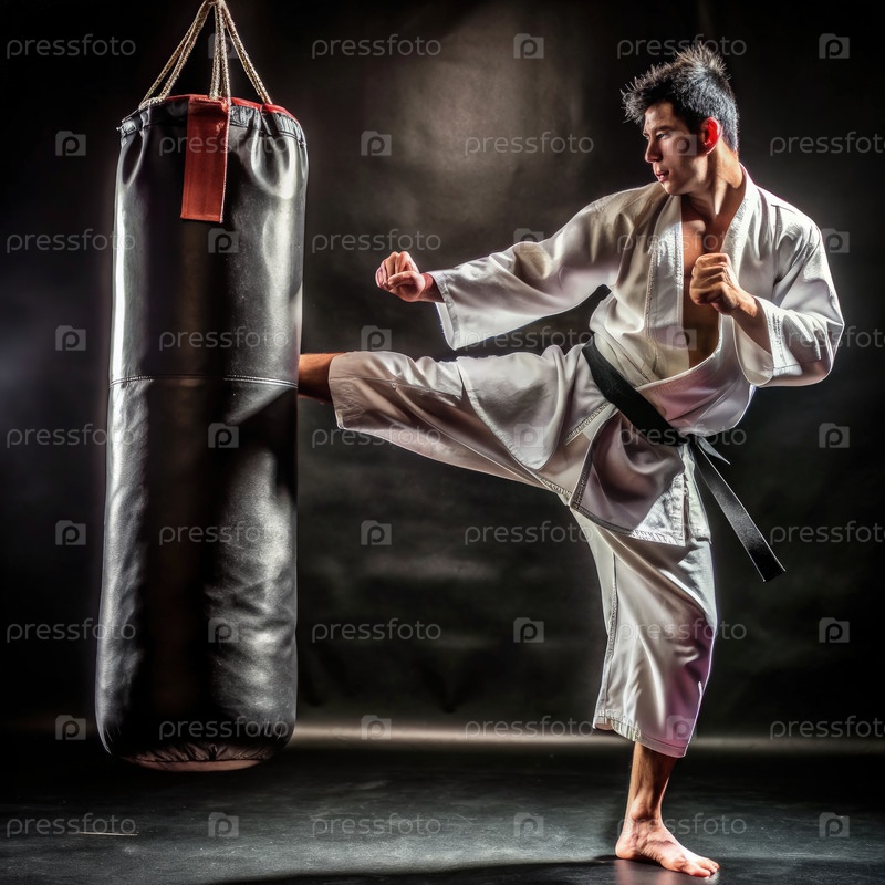 Обучение боевым искусствам: молодой человек бьет боксовый мешок в студии