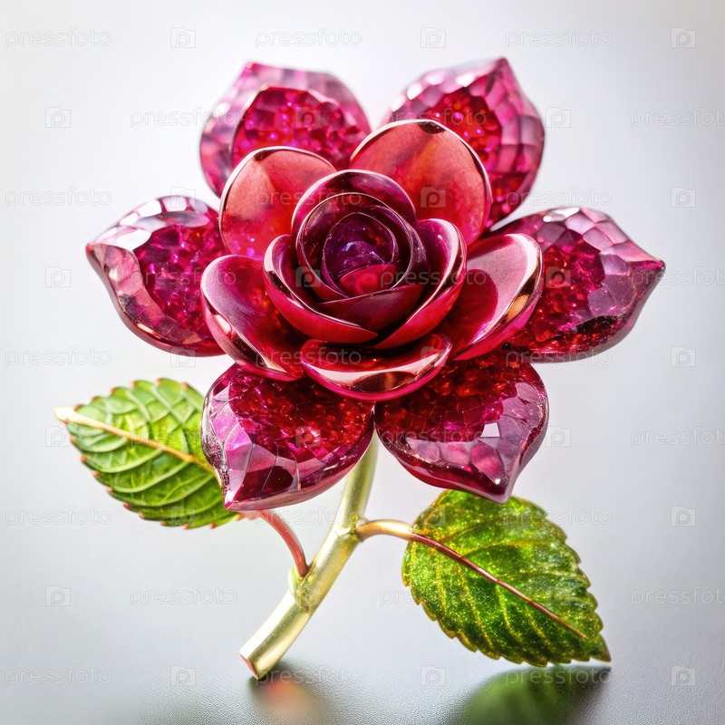 Рубино-кристаллическая роза ругоса цветочная брошка на сером фоне. генеративный AI