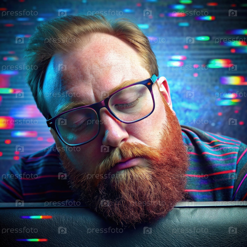 Бородатый мужчина с очками спит перед красочным цифровым дисплеем