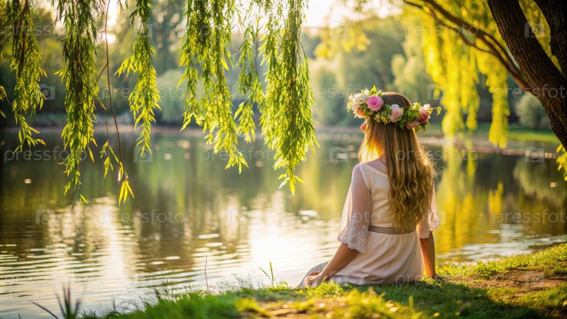 Женщина в цветочной короне созерцает на берегу реки