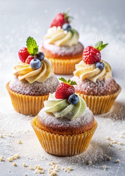 Свежевыпеченные кексы, покрытые отбивным сливком, клубницей и черники