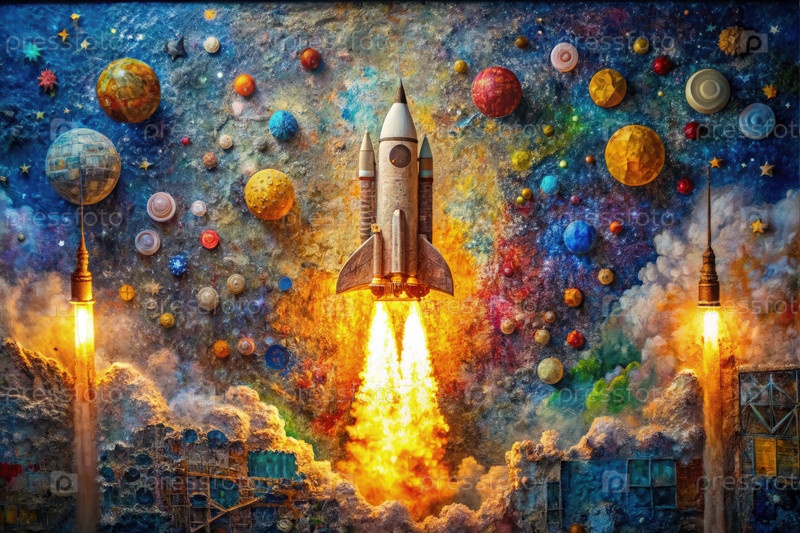 Большое полотно, изображающее запуск ракеты в красочный космический пейзаж