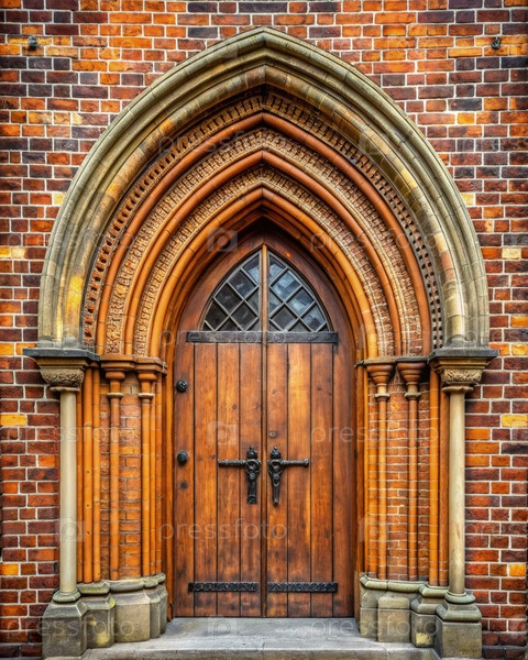 Украшенная готическая арка дверной проем в кирпичном здании