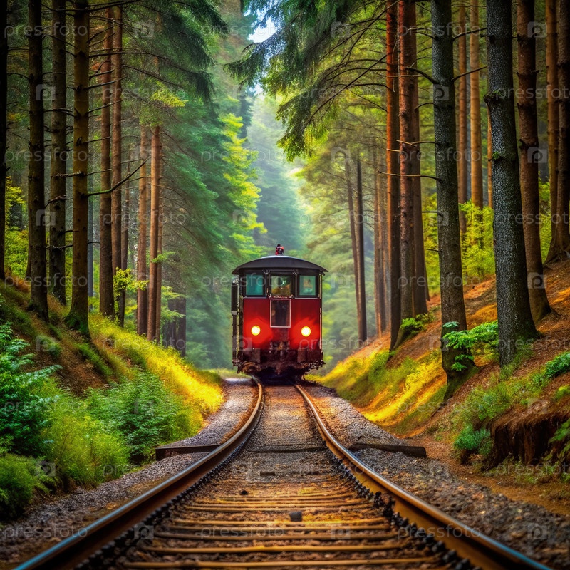 Красный поезд, путешествующий через пышные леса