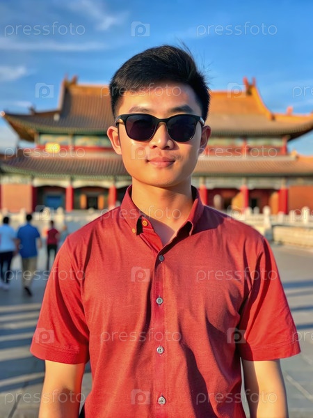 Молодой человек, носящий солнцезащитные очки перед китайским храмом