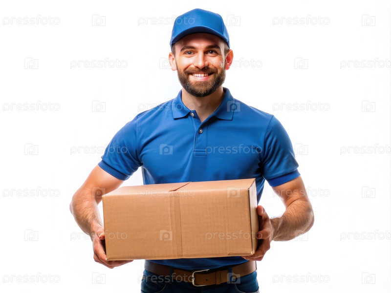 Happy Delivery Водитель держит картонную коробку на белом фоне