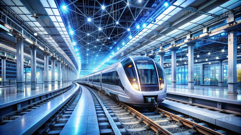 Высокоскоростной поезд входит на футуристическую железнодорожную станцию
