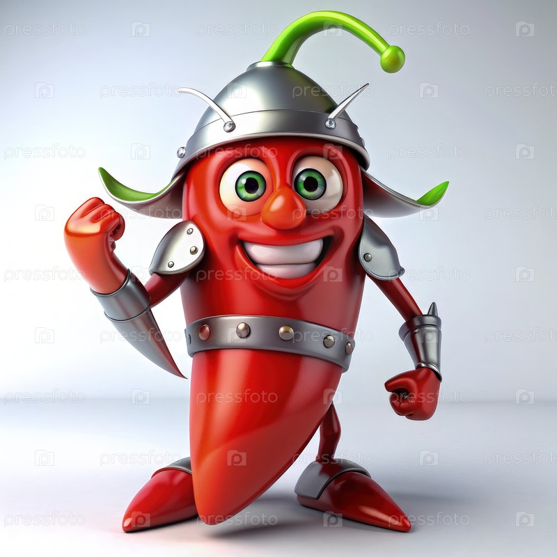 Анимационный Чили-Пеппер в доспехах гордо стоит