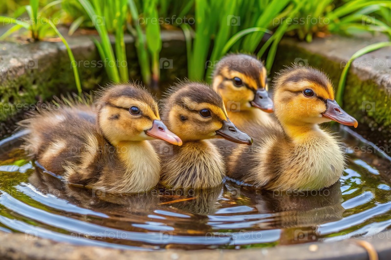 Четыре утятки, отдыхающие в каменном пруду в солнечный день