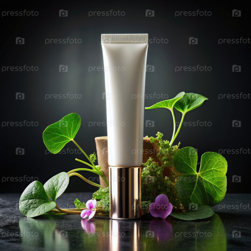 Белая лицевая сывороточная трубка с зелеными растениями и фиолетовыми цветами на черном фоне