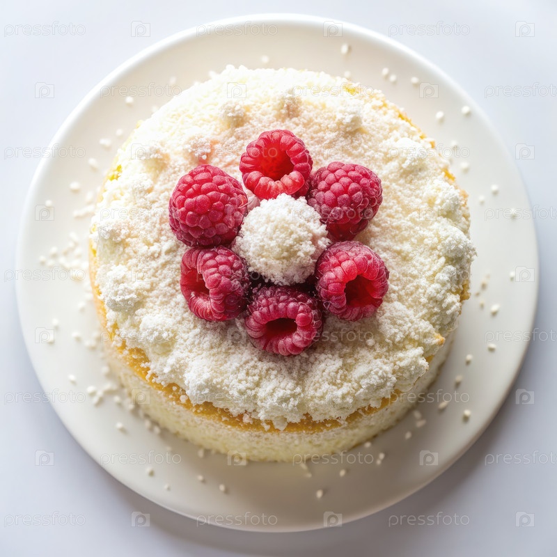 Белый торт с кокосовым орехом и малиной на белой тарелке