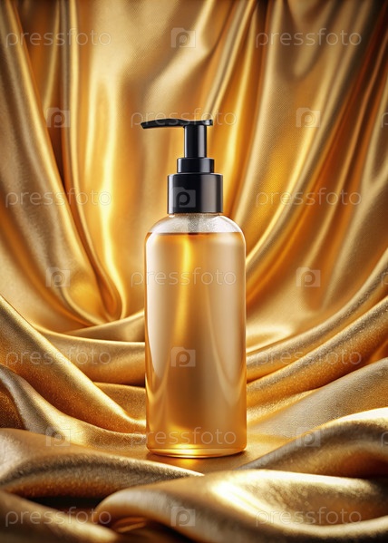 Бутылка геля стоит на фоне золотой шелковой ткани. генеративный душ AI