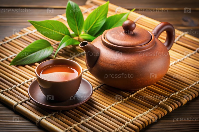 Традиционный глиняной чайник и чашка со свежим чаем на бамбуковом коврике. генеративная ИИ
