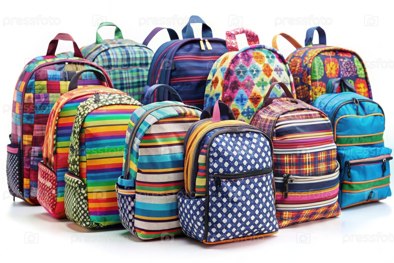 Красочные полосатые и рисунковые рюкзаки, отображаемые в ряд