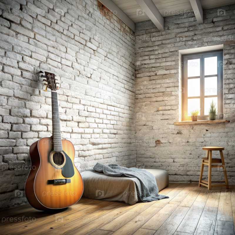 Солнечные подростковые гитаристы комната с акустической гитарой и кроватью. генеративный AI