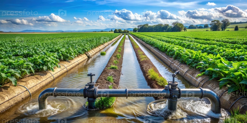 Сельскохозяйственная ирригационная система с водопроводными трубами в пышном зеленом поле