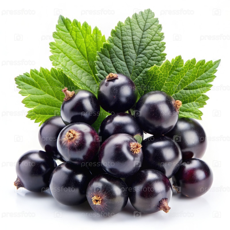 Свежие черные смородины с зелеными листьями на белом фоне