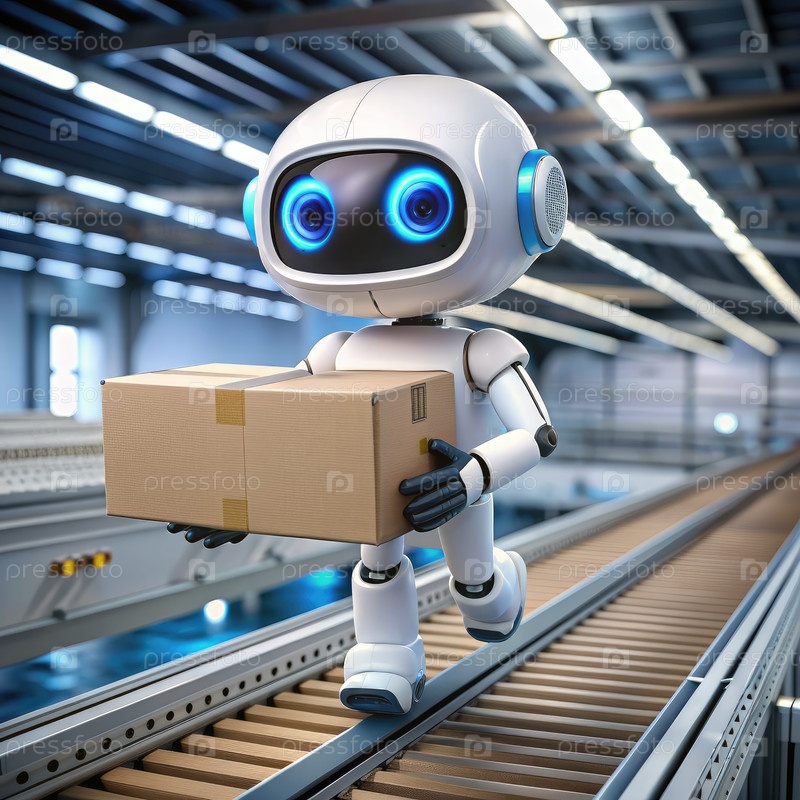 Футуристический белый робот, несущий пакет на конвейере в складе