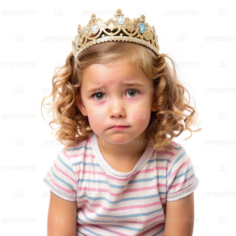 Молодая девушка в золотой короне выглядит грустно на белом фоне
