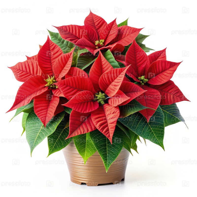Поинсетсии в коричневом горшке на белом фоне